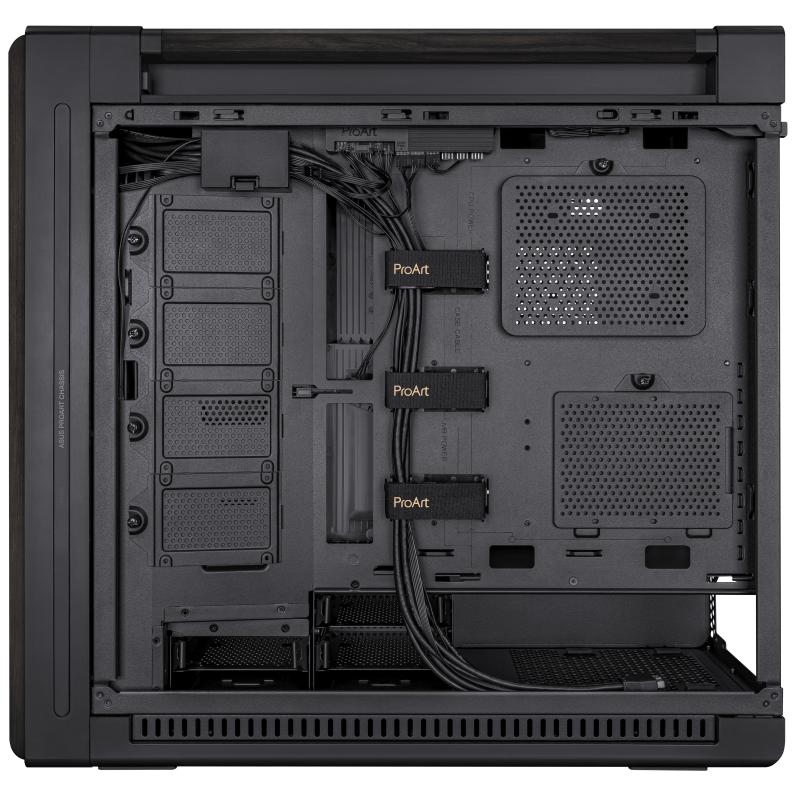 Carcasa ASUS PROART PA602 WOOD EDITION METAL Mid Tower ARGB NEGRU, Tempered Glass, Sloturi Expansiune 8+2 aditional verticale, Drive Bays: 4×3.5″/2.5″ 4×2.5″, Ventilatoare Suportate: 6 (spate: 1x120mm sau 1x140mm, fata: 2x200mm, sus: 3x120mm sau 3x140mm), Ventilatoare Incluse: 3 (spate: 1x120mm, fata: 2x200mm), Format Placa De Baza Suportat: Mini- ITX, Micro-ATX, ATX, E-ATX, Lungime Maxima Placa Video: 440mm, Inaltime Maxima Cooler Procesor: 185mm