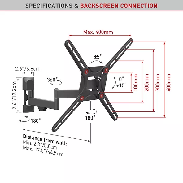 Fits TVs with VESA standard (Bracket Mounting Holes Patterns) 100×100, 100×200, 200×100, 200×200, 300×300, 300×400, 400×200, 400×300, 400×400 mm and non VESA up to 400×400 mm.